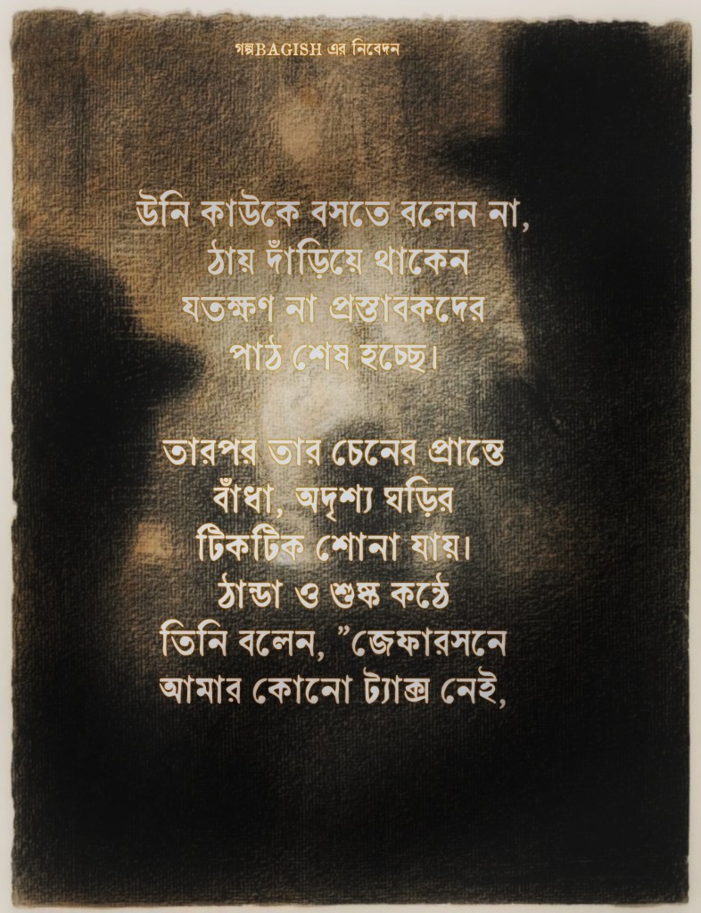 মহিলা ঘরে ঢুকতেই সবাই উঠে দাঁড়ায়- ক্ষুদ্রকায় স্থূল চেহারার কালো পোশাক পরা মহিলা, গলায় ঝোলানো লম্বা সোনার চেনের দৈর্ঘ তার কোমরের বেল্টে গিয়ে মিশে গেছে, সোনালী হাতলের বাদামী রঙের বেতের ছড়িতে ভর দিয়ে তিনি দাঁড়িয়ে আছেন। তার কাঠামো খর্বকায় হওয়ার ফলে, যে পরিমাণ চর্বি জমলে মাঝারি বা দীর্ঘকায় কাঠামোয় স্বাস্থবতী মনে হওয়ার কথা, তা ওনার শরীরে পৃথুল ও অতিরিক্ত দেখাচ্ছে। অদ্ভুত ফেঁপে যাওয়া শরীর, যেন অনেকক্ষণ জলে চুবিয়ে রেখেছিল কেউ, বর্ণটিও ঘোলাটে। চোখগুলি মুখের স্থূল পরতে নিমজ্জিত,যেন দুটো কয়লার টুকরো একতাল ময়দায় ঠেসে দেওয়া হয়েছে, যেগুলি মুখের একদিক থেকে অন্যদিকে নড়েচড়ে বেড়াতে থাকে যতক্ষণ অতিথিরা দাবী সনদ পাঠ করে।