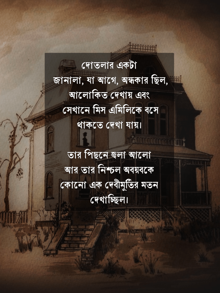 একটি বড়, বর্গাকৃতির ফ্রেমের বাড়ি যা এককালে শ্বেতশুভ্র ছিল, সুসজ্জিত, কাপোলাস এবং স্পিয়ার ও স্ক্রোল করা বারান্দার ভারী শৈলীতে আঠেরশ সত্তরের দশকের ছোঁয়া, যা আমাদের এককালের সবচেয়ে প্রিয় রাস্তার উপর তৈরি হয়েছিল। কিন্তু পরবর্তী কালে মোটর গ্যারাজ এবং কার্পাস ওয়াগনের সারি সেই পথের ধারে অভিনিবেশ করে তার সমস্ত ইতিহাস,এমনকি অগস্ট শাহাদতের ঐতিহ্যের স্মৃতিকেও কেড়ে নিয়ে মুছে ফেলে; একমাত্র মিস এমিলির বাড়িটি অবশিষ্ট ছিল, তার একগুঁয়ে এবং চটুলতা ভরা ক্ষয়ের আখ্যানকে, তুলোর ওয়াগন এবং পেট্রল পাম্পের ভীড়ের মধ্যে থেকে তুলে ধরার জন্য- এ যেন দৃশ্যদূষণের ঘাড়ে আরও এক দৃশ্যদূষণ।