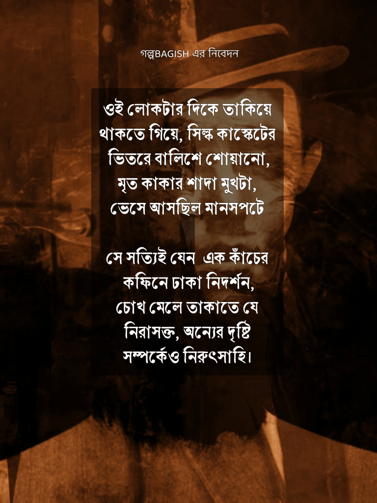 এরপরের গল্পটা নেহাতই বিরক্তিকর ও অর্থহীন শোনালো, কে তাতে বিন্দুমাত্র আগ্রহ দেখল না। যাইহোক, এতক্ষণ যা শুনেছে তাতে এক দিবাস্বপ্ন এর মতন তার চোখের সামনে সদ্যপ্রয়াত কাকাবাবুর অন্ত্যেষ্টিক্রিয়ার দৃশ্যগুলি ভেসে উঠছিল, এমন এক ঘটনা যেটা তাকে খুব বেশি প্রভাবিত করেনি, কারণ কাকা ভাইঝির সম্পর্ক খুব ক্ষীণ ছিল। আর তাই, ওই লোকটার দিকে তাকিয়ে থাকতে গিয়ে, সিল্ক কাস্কেট এর ভিতরে বালিশে শোয়ানো, মৃত কাকার শাদা মুখটা, ভেসে আসছিল মানসপটে।